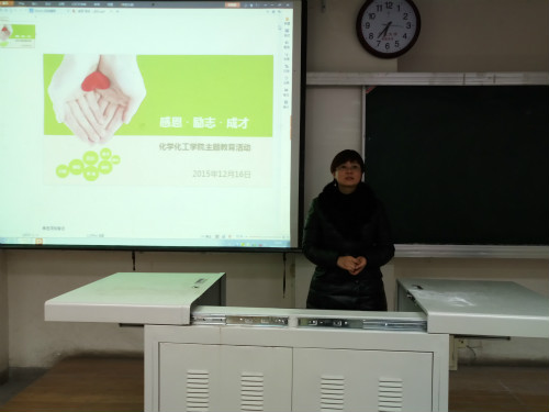 化工学院于12月16日下午5:00,在文萃校区一教122教室举行“感恩励志成才”主题实践教育总结大会。学院党委副书记潘瑞、辅导员、2014—2015年奖助学金获奖代表及200多名受资助学生参加了活动。