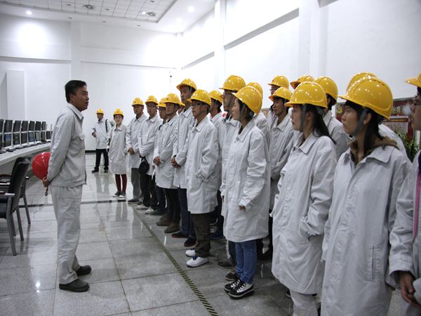 简短的座谈会后,场接待员工根据安全需要,分发了安全帽、工作服。大家穿戴整齐,在几位工人师傅带领下开始了参观活动。一进入厂区,高大的机械厂房,化工设备无不令人惊叹,一路上同学们围绕在工人师傅周围,认真听取他们的介绍。他们手指眼前的设备厂房向同学们介绍每个车间的工艺流程和他们的基本工作内容,每个环节都深深地吸引着同学们。