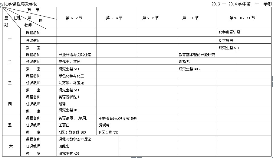 2013级全日制硕士研究生课表-课程与教学论(化学)