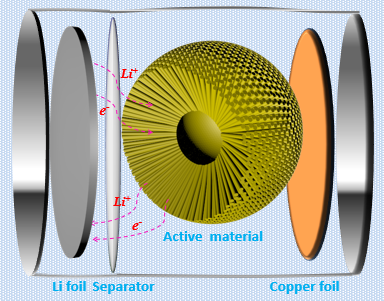 对于能量存储器件锂二次电池来说,如何进一步提高锂离子电池负极材料的电容量、循环寿命和综合使役性能仍然面临巨大挑战。近年来,一些非碳基材料由于具有高的比容量,特别是体积比容量以及较低的脱/嵌锂电位,已成为当前锂电池负极材料研究的一大方向。最近,该课题组以乙酸钴、乙酸锌和GeO2为原料在TEOA的碱性溶液中,采用湿化学法成功制得了1-D纳米棒自组装的3-D CoxZn2-xGeO4空心纳米球,组装成锂离子扣式半电池(示意图见下图)。通过x值调变系统研究了不同钴掺杂量的CoxZn2-xGeO4的电化学储锂性能。发现在最佳Co/Zn比和1000 mA g-1的电流密度下,循环100周后其可逆放电容量仍保持在882 mA h g-1。