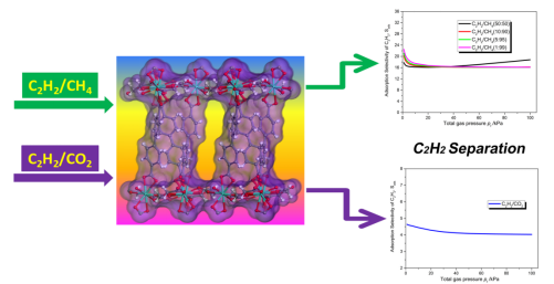 金属—有机框架物(Metal-Organic Frameworks,MOFs )是一种新型的无机—有机杂化晶态材料,在气体吸附与分离和小分子物质荧光传感与检测等领域具有巨大的应用前景而成为当今研究的热点,被誉为“21世纪最有价值的功能材料”。乙炔(C2H2)是一种极其重要的化工基础原料,其生产过程的分离环节所存在的高污染、高能耗问题长期困扰着生产企业。