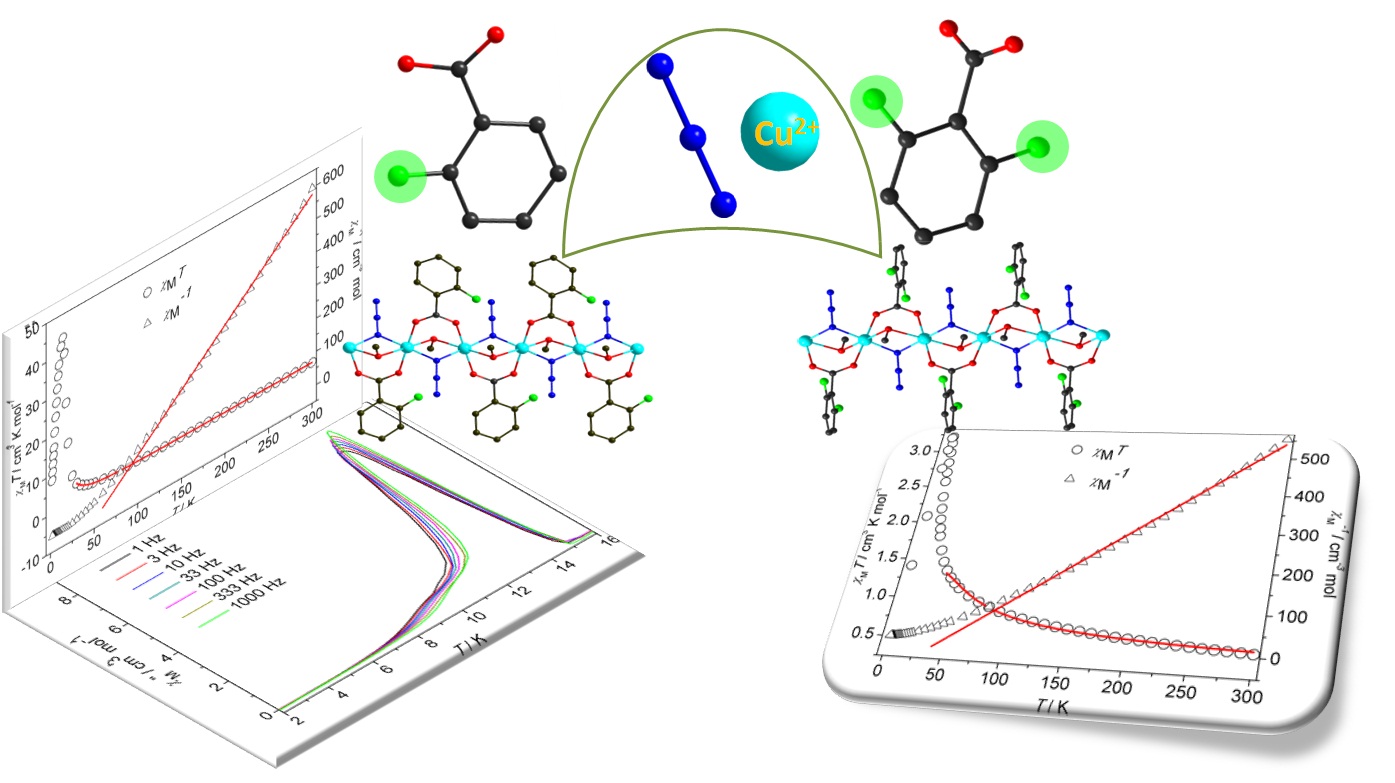 刘翔宇副教授、宋伟明教授合作开展的一维铜基分子基磁体的设计合成及磁性研究最近取得了新进展。分子基磁体作为一种新型的软磁材料在低温超导材料、磁感应、信息记录、微波材料和航天等领域有广泛的用途。课题组设计并合成了两例苯甲酸-叠氮铜链状化合物,深入研究了目标物的磁性能,并且通过理论计算定性的分析了磁耦合作用。研究工作的亮点是基于F取代基数量不同的两个苯甲酸微调了两例叠氮铜化合物的结构,进而对磁性能产生了较大影响,其中一例化合物呈现了慢磁弛豫和铁磁有序的分子基磁体特性。