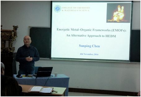 高胜利教授用通俗易懂的语言和丰富生动的图片阐述了国家自然科学基金申报技巧,从申报和评审两个角度详解了申报指南,交流分享了多次成功申报国家自然科学基金的经验及科学研究的过程。随后,西北大学陈三平教授作题为"Energetic Metal-Organic Frameworks (EMOFs): An Alternative Approach to HEDM"的学术报告。学院部分教师及全体研究生聆听了报告,提问互动环节,陈三平教授热心解答了参会师生提出的问题,诙谐的语言、严谨的态度、受到在场师生的热烈欢迎,激发了大家对科学研究的浓厚兴趣。