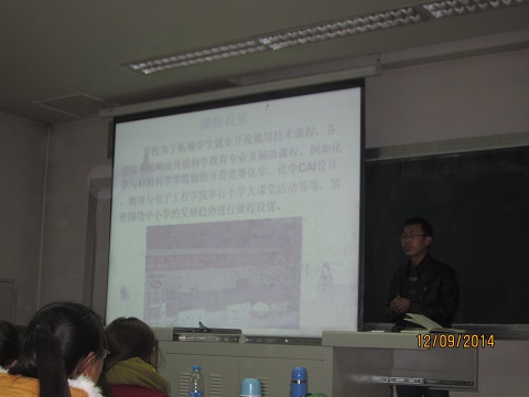 化学教师教育学科组举办“祁龙同学赴四川师范大学、贵州师范大学考察学习交流汇报会”。汇报会由吴晓红教授主持,2011级本科生祁龙进行汇报,2011级部分本科生及2012级化学(师范)专业全体本科生参加会议。